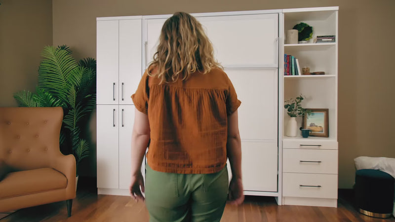 A young woman opens a sleek white Murphy Bed in a modern room—expertly crafted in Winnipeg by EMBED to maximize space without sacrificing comfort or style.